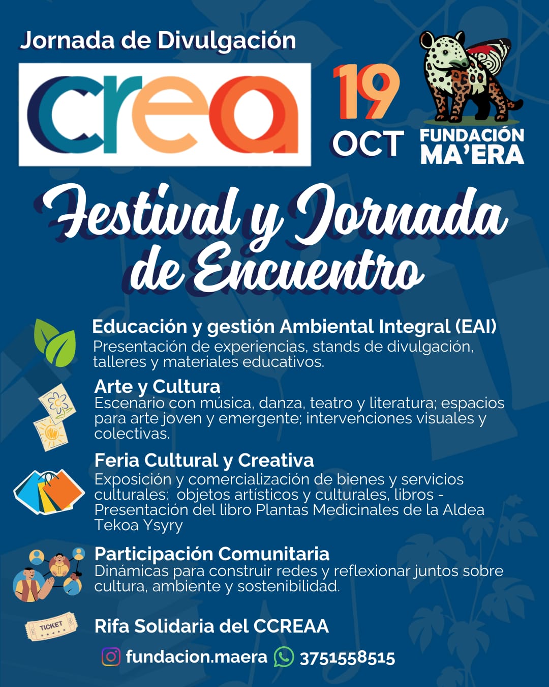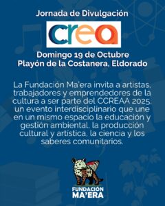 El Domingo 19 de Octubre se realizará en el Playón de la Costanera de Eldorado la Jornada de Divulgación CREA. Este evento se presenta como un festival y jornada de encuentro interdisciplinario que busca reunir en un mismo espacio la educación y gestión ambiental, la producción cultural y artística, la ciencia y los saberes comunitarios.